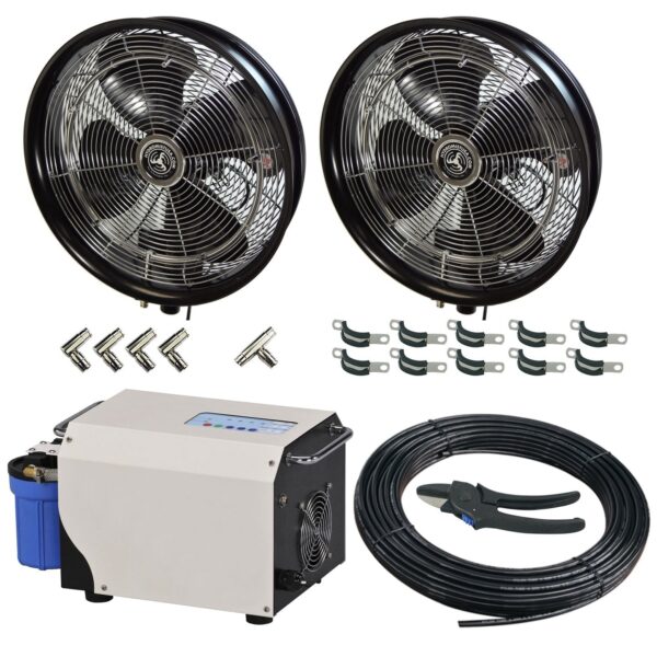 Details: HydroMist DIY complete setup for a misting fan system. Great for cooling a small-sized porch. Expandable with zero more of similar fan (or 2 more misting nozzles; 12 total in system). Easy to self install. Kit Includes: 2 Professional series misting fans: 18″ fan blades, 3-speed motor, oscillating, misting ring with 5 nozzles per fan (PN: F10-01-12), 2 fan mounting bracket, 3 speed cord control on fans, 1 Professional series, standard capacity, filtered pump w/ timed mist mode function(PN: F10-04-003)1000PSI-Very Quiet Running, 50 feet of nylon high-pressure hose, 1 nylon hose cutter, 4 elbow connectors, 10 hose clamps (attach hose to walls, etc.). Misting fan kits are a complete solution for locations that have no cooling system. Specification: No. Fans or Mist Rings: 2; Inc. NOZ/Max NOZ: 10/12; Feet of Hose: 50; Fan Speeds: 3 (460, 670, 1060); Oscillating: Yes; Pump GPM: 0.18; Volts/Amps: 110/15; Color: Black.
