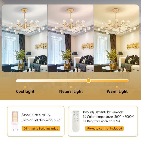 - 【Bulb and remote included】Including 18 tri-color G9 dimmable bulbs. Dimmable light fixtures are more people’s choice, with the remote control you can adjust the three light colors and color temperatures at will, the white light makes the room bright, the neutral light makes the mood soothing and pleasant, and the warm light creates the atmosphere for you