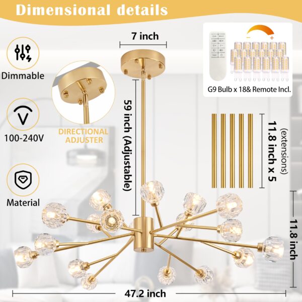 - 【Choose the right size according to your needs】This 18 lights gold sputnik chandelier is 47.2 inches long x 47.2 inches wide x 11.8 inches high,Includes five 11.8-inch extension rods, so it can be extended up to 59 inches. It can be installed on a variety of flat and sloped ceilings, is compatible with most ceiling types, and can meet your diverse installation needs