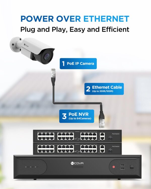 - EASY POE SETUP – PLUG & PLAY: For this 64 Channel NVR Security Systema connection, we provide two 24 ports PoE switch to connect camera and NVR by a single network cable, running power and video transmission simultaneously without additional power outlet.