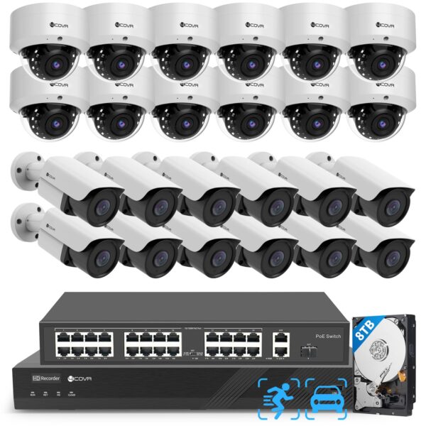 4COVR PoE 32 Channel Security Camera System, 12 Dome IK10 Vandal-Proof 12 Bullet 5MP Commercial IP Camera IP67 Night Vision, AI Human/Vehicle Detection, Business H.265 UHD NVR 8TB HDD, LYH54A5M3224