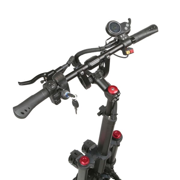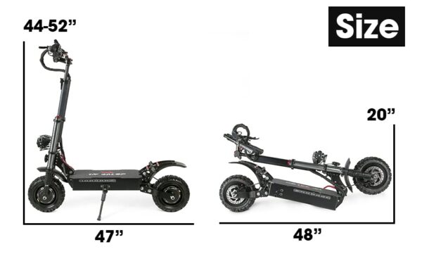 - Safety escort: The T88Pro 5600w electric scooter is upgraded with front and rear hydraulic disc brakes and electronic brakes, the engine is automatically turned off in an emergency, and the speed control is quick and the braking distance is shortened. The thickened double front shock absorber can effectively filter 98% of terrain impacts, and it can drive smoothly even on steps