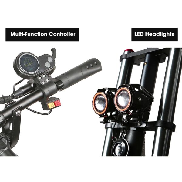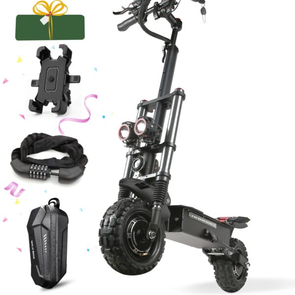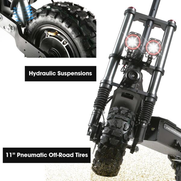 - New UPGRADE: The T88Pro 5600w electric scooter is made of one-piece aluminum alloy body, with a maximum load capacity of 550LBS, with 11″ off-road vacuum tires for greater comfort and off-road capability. Brighter double headlight can make the irradiation range wider and irradiation distance farther