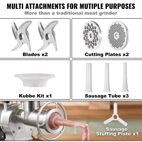 - Bonus Accessories: This classic meat grinder includes: Two 420 stainless steel blades, two different sizes cutting plates (4.5/10mm) for coarse and fine grinding of meat, one sausage stuffing plate, three different sizes sausage tube, one kubbe set and a cleaning brush.