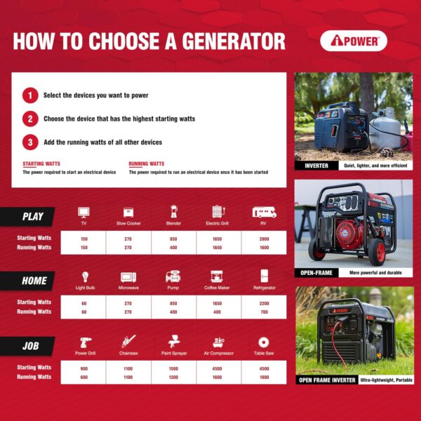 - Pure Power: 3% THD of clean power output. Inverter technology provides clean stable source of power for sensitive electronics such as, laptops, TV’s, phone chargers and sensitive power tools.