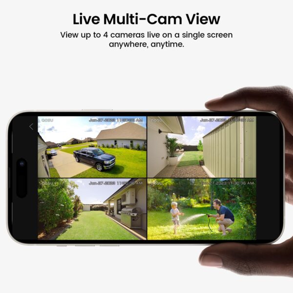 - View 4 Camera Feeds Simultaneously: Keep eyes on four areas at once—all from a single screen. No more switching between cameras. This wire-free system offers real-time, multi-camera viewing in the app, saving you time and ensuring you never miss a moment. Easy setup, total coverage.