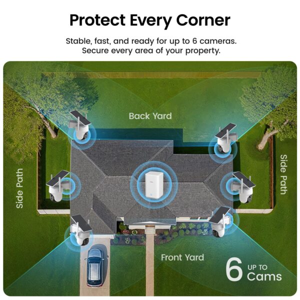 - New 2nd Generation Homebase – Smarter, Safer, and More Flexible: Supports up to 6 cameras for wider, more flexible home coverage. Enjoy 100% local storage with no monthly fees or subscriptions.Includes a 32GB of local storage, expandable up to 1TB (not included), offering 5+ years of event storage directly in the Homebase. Even if your cameras are lost or damaged, your footage stays safe. (SolarCam D1 Classic Kit does not support 6-cameras.)