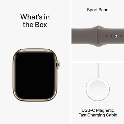 Apple Watch Series 9 [GPS + Cellular 45mm] Smartwatch with Gold Stainless Steel Case with Clay Sport Band S/M. Fitness Tracker, Blood Oxygen & ECG Apps, Always-On Retina Display