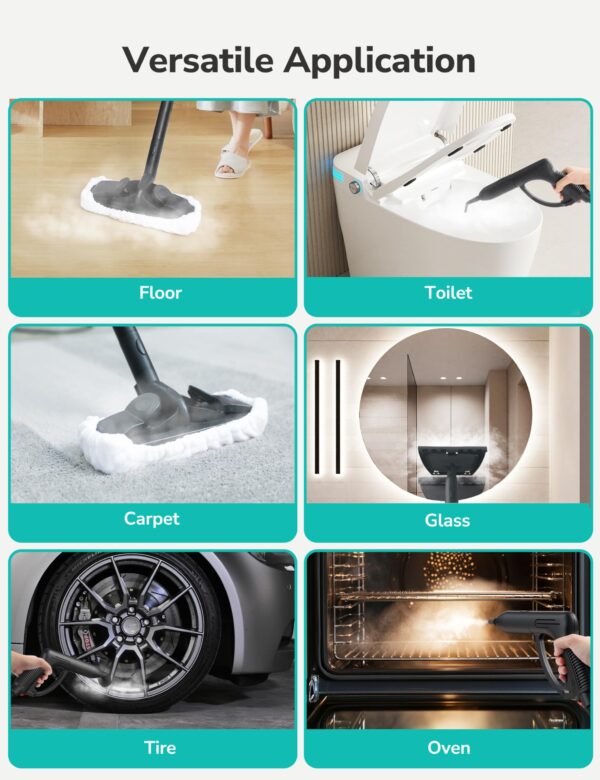 - Comprehensive Accessory Kit: The steam cleaner comes with 16 versatile accessories and nozzles designed to tackle dirt, grease, and grime effectively. Perfect for cleaning floors, carpets, grout, kitchen countertops, and appliances, making your cleaning tasks a breeze.