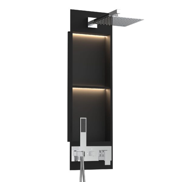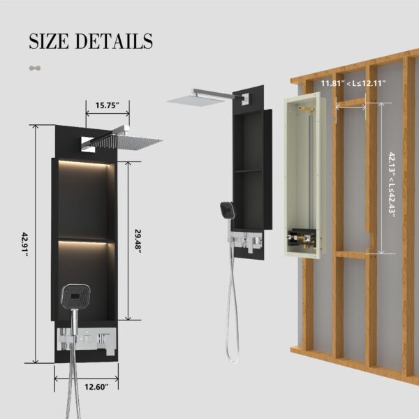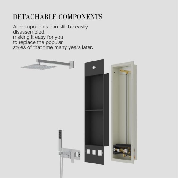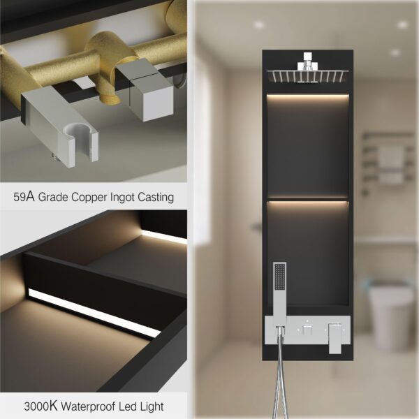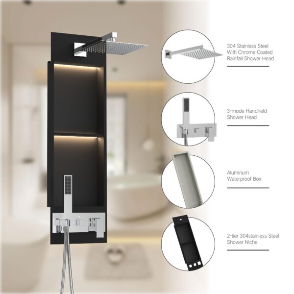 - 【Premium Construction】The shower niche is crafted from durable 304 stainless steel for long-lasting quality, the waterproof box is made of aluminium. The handheld shower head is made of abs and the shower hose is made of pvc, the rest of panel part with switch is made of 59A grade copper ingot.