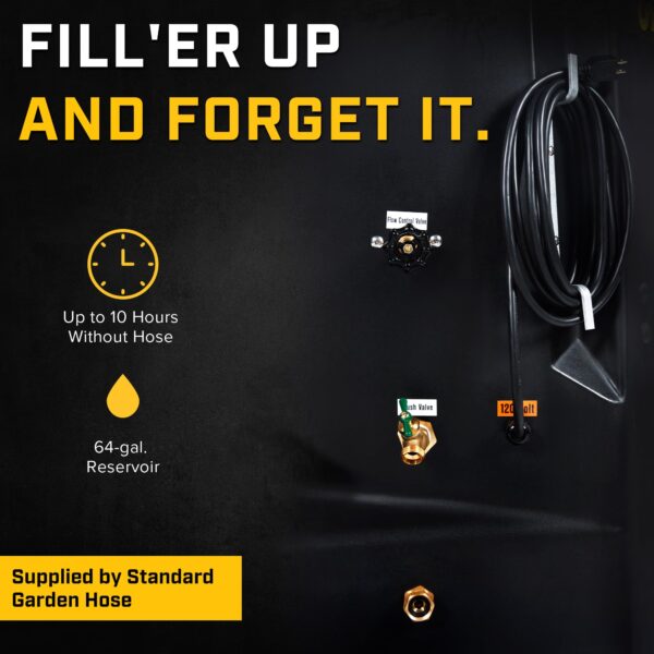 - Convenient Water Supply: The Cool-Space 500 Swamp Cooler offers hassle-free operation with a standard garden hose connection. Its large 64-gallon tank provides up to 10 hours of continuous cooling, enhanced by a low water indicator, ensuring portability and convenience without needing a constant water source
