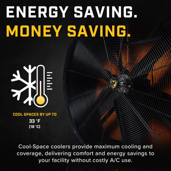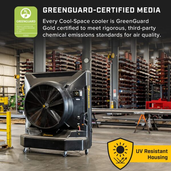 - Long-Lasting Cooling Media: Enjoy durable and consistent cooling with the Cool-Space 500’s 8-inch-thick cooling media. Automated maintenance reminders offer convenience when it comes time to replace media, tablets, and water refills. Designed to withstand frequent cleanings and block dirt penetration, it ensures long-lasting and efficient performance, making it the industry’s most effective cooling media