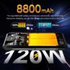 - 【120W Fast Charge & Harman KardonSmart-PA Speaker】The BL9000 Pro 5G rugged smartphone features 120W super-fast charging, allowing it to reach 50% charge in just 20 minutes! Rest for a moment to fully charge your phone. With an upgraded solid-state battery, it ensures greater safety and longer battery life compared to liquid batteries. The 8800mAh battery supports 576 hours of standby time, 31 hours of calling and 9.5 hours of game. Additionally, the OTG function turns the BL9000 Pro into a mobile power source for other device. Featuring dual Harman Kardon Smart-PA speakers for superb sound quality even in noisy environments, it’s perfect for clear calls and music playback.