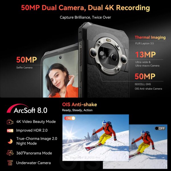 - 【FLIR Thermal Imaging Camera & Dual 50MP Anti-shake Camera】Blackview BL9000 Pro unlocked phones features advanced photo algorithms and a 50MP true color front camera with support for beauty modes, allowing you to take more natural looking photos. The BL9000 Pro also features a professional-grade 50-megapixel anti-shake rear camera and a 13-megapixel 120° Ultra Wide Angle and Ultra Macro camera. Support OIS anti-shake, you no longer need to worry about blurred photos. Enjoy up to 4K video recording to capture life’s moments in high definition. The BL9000 Pro also features an underwater mode, a night mode that allows you to take photos and videos while exploring underwater and at night.