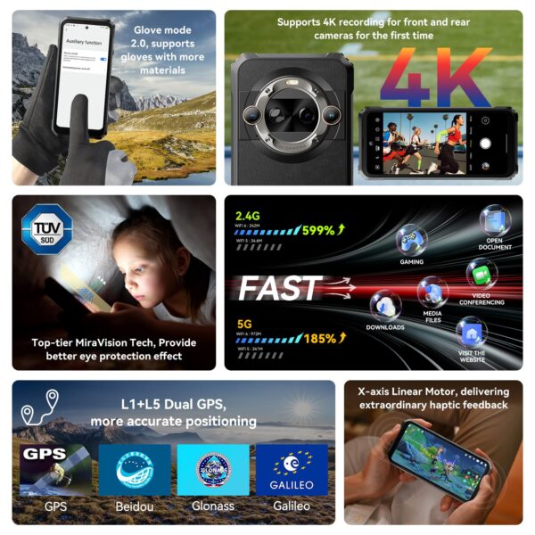 - 【120Hz & Waterproof and Tough TÜV SÜD Low BlueLight Display】Explore the Blackview BL9000 Pro’s 2.4K 6.78″ FHD+ Display, delivering fluid visuals in fast-paced games. Enjoy vibrant colors, sharp contrasts, and a million shades for unparalleled clarity in all scenarios. The 120Hz dynamic refresh rate ensures swift response and effortless browsing or gaming. Boasting a 2408*1080 resolution and 600 nits brightness, the BL9000 Pro rugged phone 5g delivers an immersive visual experience with ultra-high resolution, making every frame crisp and vivid. Enhance your screen experience with TÜV SÜD Low Blue Light and three eye-care modes, reducing eye strain effortlessly.