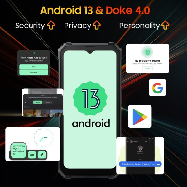 - 【Android 13 & Doke OS 3.1 System】The BV4800 rugged smartphone unlocked come equipped with the lAndroid 13 operating system, enhancing privacy and personalization experience. This Android 13 android phones offers per-app language preferences, a data migration assistant, cleared clipboard history, notification permissions, easy sharing, and real-time subtitles. There’s more! With the Doke OS 3.1 integration, enjoy additional functionalities like call recording and exercise index tracking.