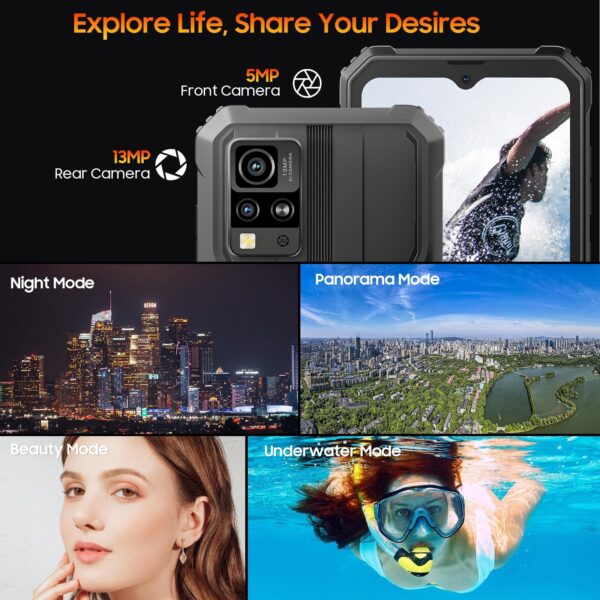 - 【Waterproof Camera & Multiple Photo Modes】 Blackview BV4800 smart phone adopts the advanced camera algorithms, 13MP ultra-sharp main camera to help users get the most out of its photography and shoot more like a pro. Experience 360° Panorama Capture, Underwater Mode, Night Mode, Improved HDR, 0.1s Ultra-fast PDAF such as to stimulate your creativity in taking photos. 5MP front camera can be combined with a beauty selfie mode, captures ultra-sharp bright photos.