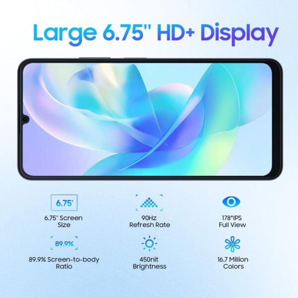 - 【6.75-inch Large Screen & Smart-K Box Speaker】Blackview COLOR 8 unlocked cell phone features a 6.75-inch display, offering over 90% screen usage and a smooth 90Hz refresh rate, providing a more comfortable viewing experience. High-fidelity colors, clear images, and Smart-K box speaker technology make movies and games more exciting. Enjoy full viewing angles, 10-point touch technology, and a bright display of up to 450 nits for happy moments anytime.