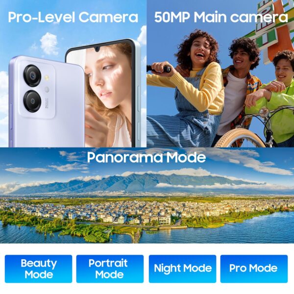 - 【50MP Camera & Smart ISO & Multiple Photo Modes】Capture stunning images with the JN1 camera, featuring a maximum resolution of 50MP. This smart phone also supports Smart ISO, delivering ultra-high resolution, high speed, and optimal color reproduction. In changing light, the ISOCELL JN1 sensor of COLOR 8 auto-adjusts its pixels, and Tetrapixel technology boosts low-light photos, helping users shoot like a pro. Experience 360° Panorama Capture, 1080P Video Recording with Beauty Mode, Night Mode, HDR, and more to stimulate your creativity in photography. The 8MP front camera, combined with a beauty selfie mode, captures ultra-sharp and bright photos.