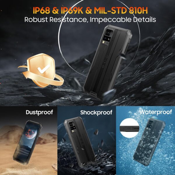 - 【5180mAh Battery & Waterproof ArcSoft Camera】The waterproof smartphone’s powerful 5180mAh battery keeps you connected 24/7, ensuring you can make calls, browse the web and stream media without worrying about running out of juice. The included 10W charger provides fast, efficient charging for your convenience. Additionally, the unlocked rugged smartphones features dual 13MP + 5MP waterproof ArcSoft camera and a variety of shooting modes that allow you to get creative and take professional-quality photos and videos in any environment.