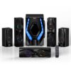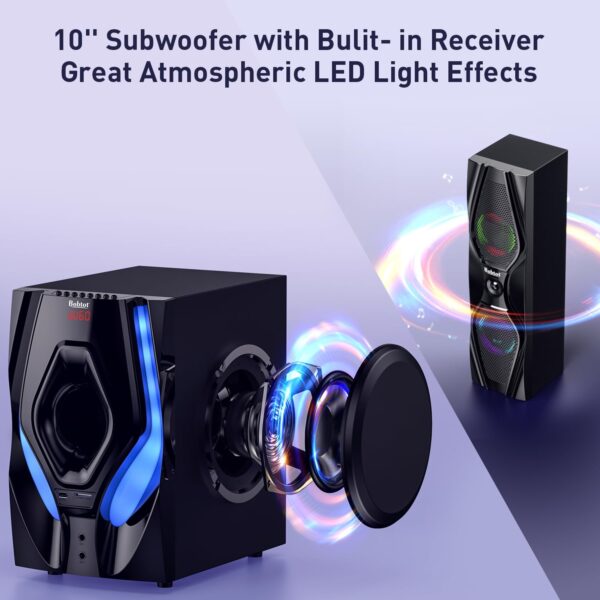 - LED Light Effects: The Bluetooth surround sound speakers uses high-quality materials, with LED lighting effect which makes full of atmosphere. The Subwoofer unit has 4 LED lighting modes(blink to the beat, solid on, spectrum EQ analyzer, Turn off) , you could switch via press the ” Lighting” button on the full function remote