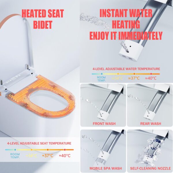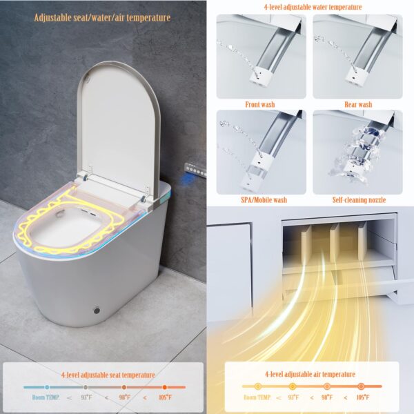 - Warm water and warm air toilet: Tailor your experience with 4-level adjustable heated seat, water, and air temperatures. Our modern smart bidet toilet caters to your personal preferences, providing the ultimate comfort during every use.