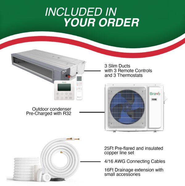 BRAVO 30,000 BTU 3 Zone 9000 + 9000 + 9000 BTU Concealed Duct Mini Split A/C and Heater with 25ft Installation Kits