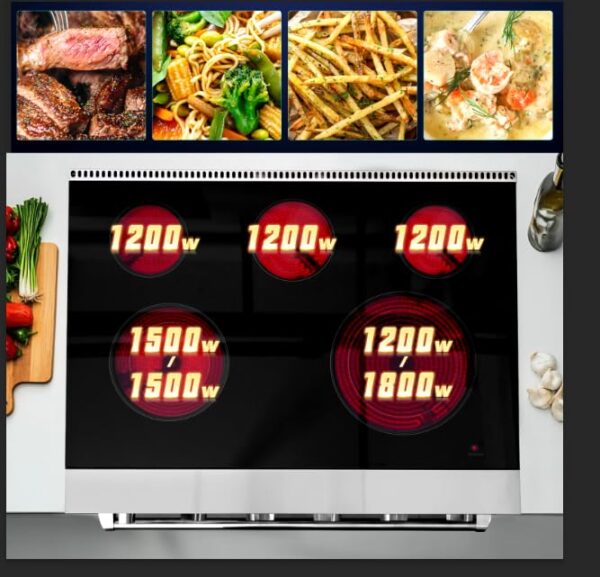 - POWERFUL 5-BURNER INDUCTION COOKTOP:This 36-inch electric cooktop comes with five powerful burners (3000W, 3000W, 1200W, 1200W, 1200W) to support a wide range of cooking techniques such as boiling, sautéing, and braising. Whether you’re making a quick meal or preparing a gourmet meal, this electric oven ensures precise heat control for efficient cooking every time.