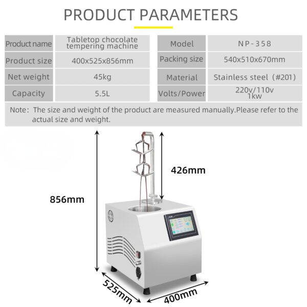 Details: Make smooth, shiny chocolate with this 5.5L Chocolate Tempering Machine. Perfect for bakeries, chocolate shops, or home kitchens, it melts and tempers chocolate evenly and quickly. Made of stainless steel, it’s easy to clean and built to last. The digital control panel lets you adjust the temperature easily for perfect results every time. Great for making truffles, candy bars, chocolate molds, and more.
