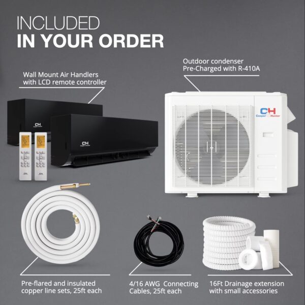 • System comes with Installation Kits for each air handler including 25ft Pre-Flared and Insulated Copper Line Set, 25ft Communication Wires between Indoor and Outdoor unit, Small Accessories and a 16ft Drainage Extension. This is not a DIY equipment, professional installation is required.