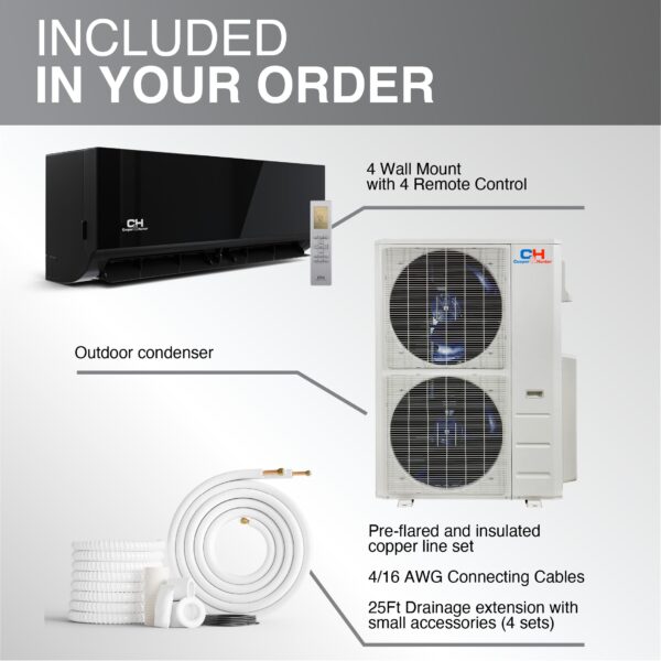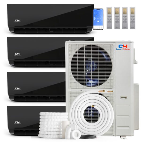 Cooper & Hunter 48,000 BTU 4-Zone Ductless Mini Split Air Conditioner & Heat Pump – 12K+12K+12K+12K Wall Mount Air Handlers – 24 SEER2 – 25FT Installation Kits – 230V – Midnight Edition