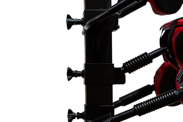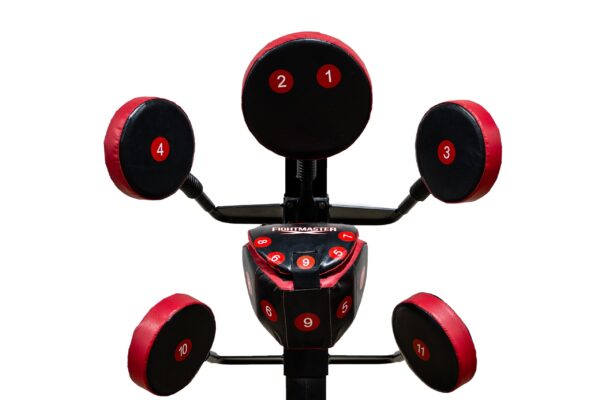 Details: The Core Home Fitness FightMaster, invented by former Australian Champion Boxer – Rai Fazio, is a new form of boxing style conditioning which creates the ultimate target striking training station for your home or studio. Key to this design is the use of the patented reactive rod system attached to each pad/target. These rods have been set up to replicate punching a focus mitt, by offering a slight “give” in the pads on impact. Each pad has been set up specifically to replicate different styles of punching, allowing the user to throw any punch, or any combination of punches. The result is a significant reduction in the risk of injury to users or training partners while delivering an unparalleled boxing experience. This truly unique product combined with an effective program will change the face of fight conditioning for all all athletes. 11 perfectly positioned and angled striking pads to accommodate a variety of specific punches – straights, jabs, hooks, upper cuts Pads 1-4 for Straight Rights or Lefts and Jabs Pads 5-9 for Hooks and Upper Cuts Pads 10-11 for Body Rips All pads feature ripstop material and utilize debossed numbers with high vis white numbers Adjustable upper and lower shuttle makes a perfect fit for athlete heights from 5’0″ to 6’6”. Frame Construction: 11 gauge steel.