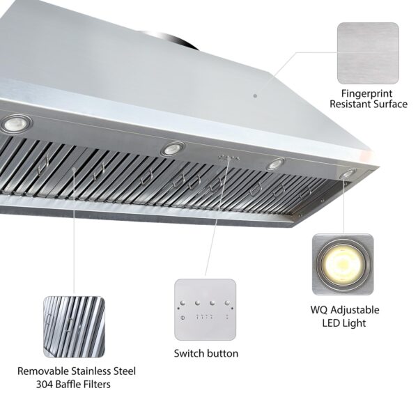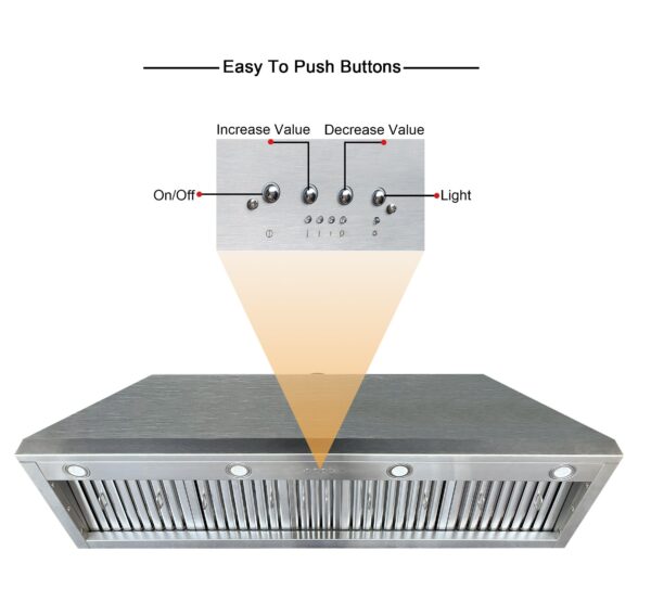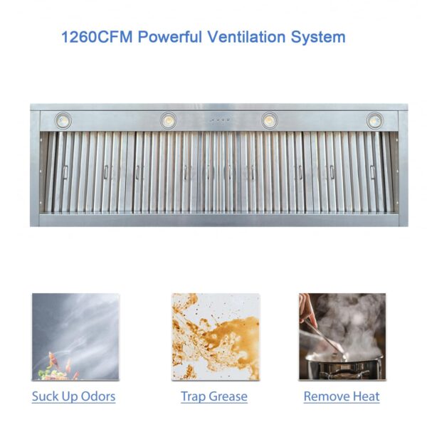 - POWERFUL HOOD INSERT: This copper vent hood features a strong blower with suction power up to 1260 CFM. This helps to efficiently remove smoke, grease, odors, steam, and heat from your kitchen. The LED lights provide better visibility for cooking at night. The push button controls allow you to easily adjust 4 levels of fan speed and LED Lights.
