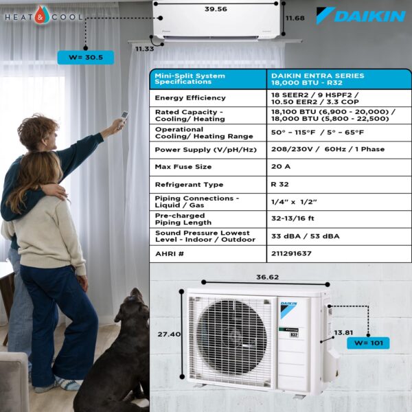 Details: Daikin 18 SEER2 ENTRA series single zone inverter wall-mounted systems provide energy efficiency and comfort control with an affordable, cost-saving solution. These heat pump systems feature streamlined, wall-mounted indoor units paired with quietly compact outdoor units. Daikin ENTRA single-zone inverter wall-mounted units are simple to install. The curved contour design blends to match with any home décor and is ideal for single room enhancements, spaces requiring additional heating or cooling, and additions. The air direction and flow rate are adjustable so that the air will not blow directly at people in the room.
