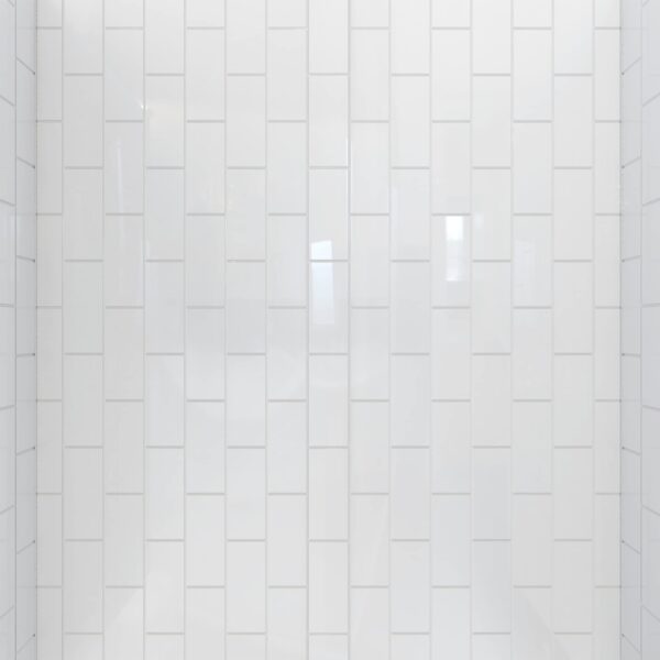 - Shower base installation is direct to stud; White, trim-to-size shower walls are glue-up