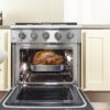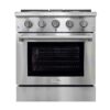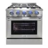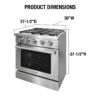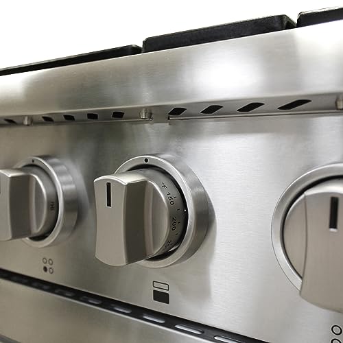 • LOADED WITH FEATURES: Large knobs, dual burner, continuous grates, 4 sealed burners, 4.2 cu. ft. capacity, porcelain oven, stainless steel drip pan, and a sleek industrial size pole handle. Product Dimensions: 30″ (W) x 27.5″ (D), 37.5″ (H). Electrical requirements: 120V / 60Hz / 5Amp