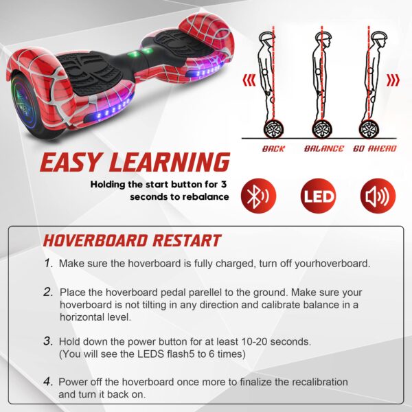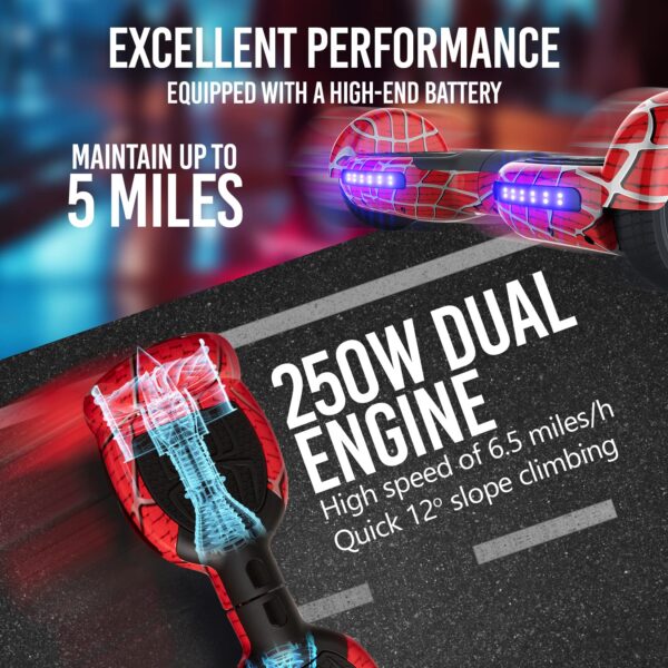 • 【Eye-Catching Spider Design】The Emaxusa hoverboard stands out with its unique spider-themed design and vibrant LED lights. This eye-catching look adds an element of fun and excitement to every ride, making it a favorite among kids.