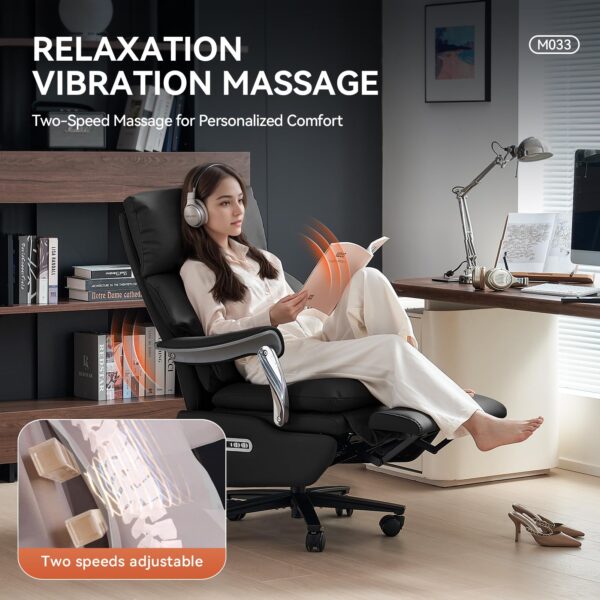 - Low Back Vibration Massage: The 400lbs office chair is nice for both home and office use, offering exceptional comfort for long hours. Its ergonomic design provides full support for your spine, head, neck, lumbar region, and feet, promoting proper posture and reducing strain. Additionally, the built-in low back massage and vibration function help relieve muscle tension, improve circulation, and enhance relaxation, making it the good chair for maintaining comfort and focus throughout your workday