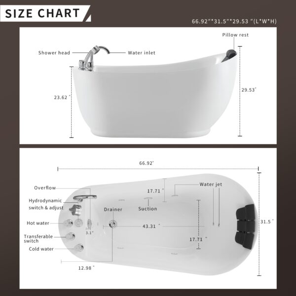 • Spacious Dimensions: This freestanding whirlpool bathtub measures 66.93″L x 31.5″W x 29.53″H.The internal dimensions are 43.31″L x 17.72″W x 17.72″H, with a soaking depth of 14.5″, offering a spacious and comfortable bathing experience.