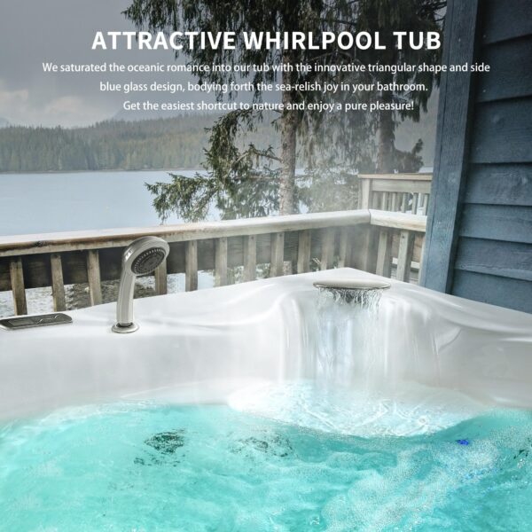 • Beautiful Whirlpool Tub: We saturated the oceanic romance into our tub with the innovative triangular shape and side blue glass design, bodying forth the sea-relish joy in your bathroom.Get the easiest shortcut to nature and enjoy a pure pleasure!