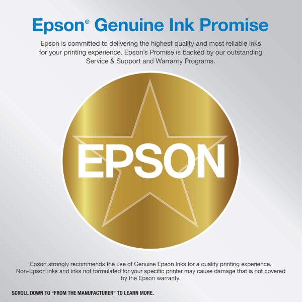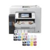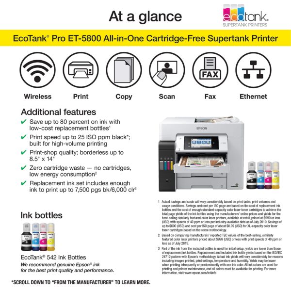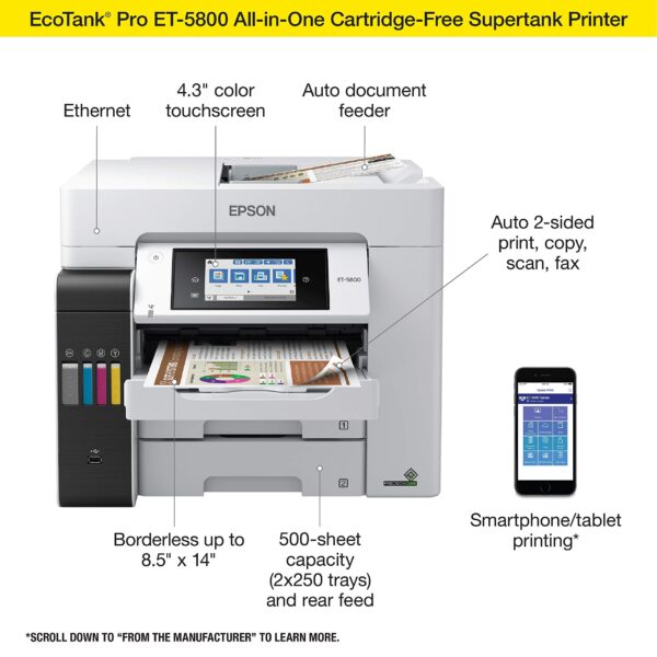 Details: The EcoTank Pro ET-5800 wireless all-in-one offers fast Cartridge-Free Printing with easy-to-fill supersized ink tanks. You can save up to 80 percent with low-cost replacement ink bottles vs. standard-capacity color laser toner cartridges (1) – about 2 cents per color ISO page versus 14 cents with cartridges (1). PrecisionCore Heat-Free Technology delivers high-volume, print-shop-quality output, plus speeds up to 25 ISO ppm black (ƚ). This all-in-one with Epson DURABrite pigment-based ink delivers vibrant borderless prints up to 8.5″ x 14″. Each replacement ink set includes enough ink to print up to 6,000 pages (2). Plus, there’s zero cartridge waste and very low energy consumption (3). The ET-5800 features two 250-sheet front paper trays and a rear specialty-paper feed, plus a 4.3″ color touchscreen and hands-free voice-activated printing (4). *The NPD Group, Total Channel Tracking Service, U.S. & Canada, Inkjet SF/MF Printers, Refillable ink tank included, based on units, February 2019 – January 2020. Supertank printers are defined as refillable ink tank printers. **2 Years of Unlimited Ink promo valid for ET-5150, ET-5170, ET-5180, ET-5800, ET-5850, ET-5880, ET-16600 or ET-16650 printers purchased from 10/1/2021 to 3/31/2025. Product must be registered within 30 days of purchase. Limit four 542 ink bottles per claim. Each claim cannot contain multiple bottles of the same color. Retain your empty 542 ink bottle for submission along with rebate form. Promotion applies to ink only. Printer covered by Epson 2-year ltd wnty with registration. For promo participation, you must register your product. See manufacturer’s website for details. Ƚ Black print speeds are measured in accordance with ISO/IEC 24734. Actual print times will vary based on factors including system configuration, software, and page complexity. 1. Actual savings and costs will vary considerably based on print tasks, print volumes and usage conditions. Savings and cost per ISO page are based on the cost of replacement ink bottles and the cost of enough standard-capacity color laser toner cartridges to achieve the total page yields of the ink bottles using the manufacturers’ online prices and yields for the best-selling similarly featured color laser printers, available at retail, priced at $999 or less (USD) with speeds of 40 ppm or less per industry-available data as of July 2019. Savings of up to $600 (USD) and cost per ISO page of about $0.09 (USD) for XL-capacity color laser toner cartridges based on the same methodology. 2. Part of the ink from the included bottles is used for initial setup; yields are lower than those of replacement ink bottles. Replacement and included ink bottle yields based on the ISO/IEC 24712 pattern with Epson’s methodology. Actual ink yields will vary considerably for reasons including images printed, print settings, temperature and humidity. Yields may be lower when printing infrequently or predominantly with one ink color. All ink colors are used for printing and printer maintenance, and all colors must be available for printing. 3. Based on comparing manufacturers’ reported TEC values of the best-selling, similarly featured color laser printers priced about $999 (USD) or less with print speeds of 40 ppm or less as of July 2019. 4. Epson Connect account and voice-activated account registration required. 5. Most features require an Internet connection to the printer, as well as an Internet- and/or email-enabled device. 6. Wi-Fi CERTIFIED; level of performance subject to the range of the router being used. Wi-Fi Direct may require printer software. 7. 12 months of standard limited warranty or 80,000 plain paper sheets (whichever happens first). For an additional 12-month extended service plan (total of 24 months or 80,000 plain paper sheets, whichever happens first), register your product and use Epson genuine ink bottles. See Limited Warranty for details. 8. SmartWay is an innovative partnership of the U.S. Environmental Protection Agency that reduces greenhouse gases and other air pollutants and improves fuel efficiency.