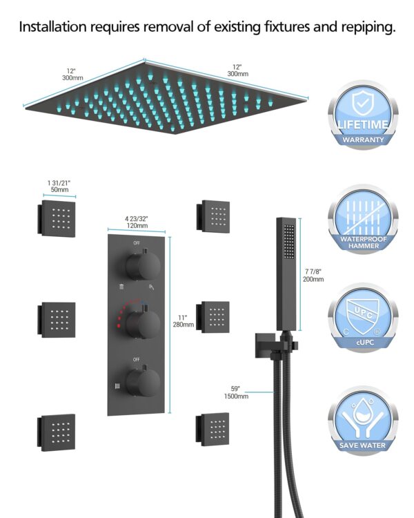 - 12″ Ultra-thin Shower Head: Modern design concealed installation shower system, make your bathroom more modern and elegant. This overhead offers more coverage so that you can get fully enveloped in the water. The LED lights are powered by electricity and you can use the remote control to adjust the color temperature. You will enjoy a spa-like shower just like in a soothing downpour.