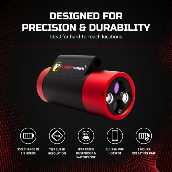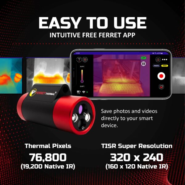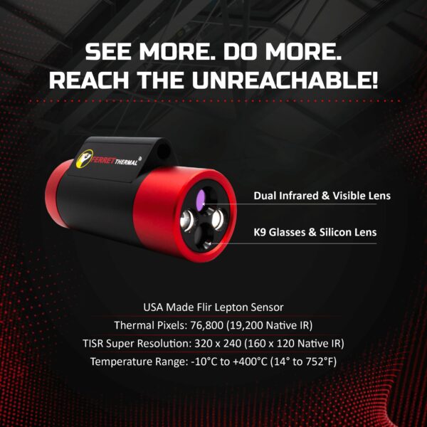 - See more and do more with Ferret’s 320×240 TISR Super Resolution (160×120 Native IR). Get extended reach – Attach the Ferret Thermal imaging camera to poles or rods for thermal vision in hard-to-reach areas. Ideal for HVAC, plumbing, pest control, electrical and general building inspections.