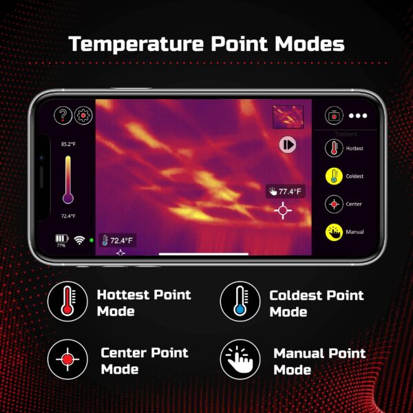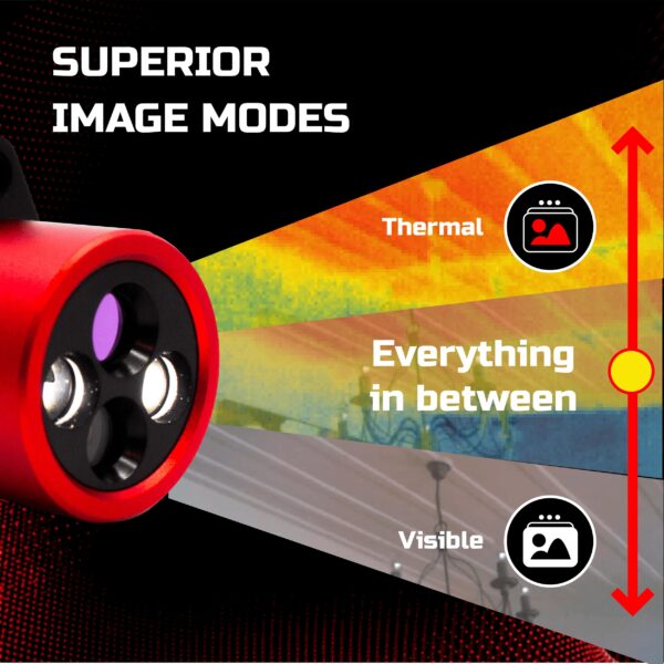 - Advanced thermal imaging modes – Easily switch between thermal, visible, and everywhere in between, and various color palettes in your thermal camera to highlight details and quickly identify issues.