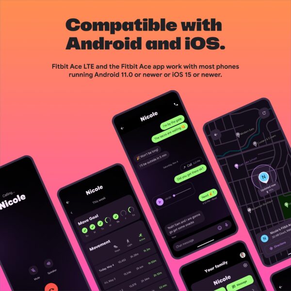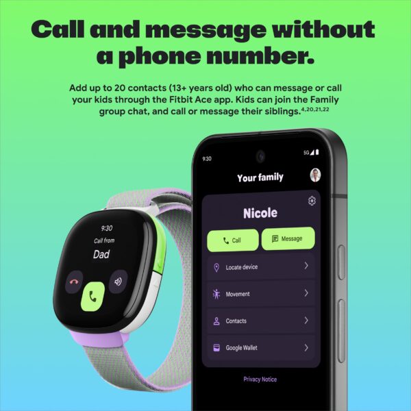 - IN-APP CALLS & MESSAGES WITHOUT A PHONE NUMBER – Stay connected and add up to 20 contacts (ages 13 and up) for them to call and message with; Works with most Android 11.0 or newer or iOS 16 or newer[20,21,22]; Google account and Fitbit Ace app required.