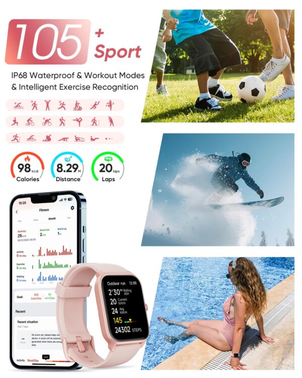 • 【1.8” HD Screen & 102 Watch Faces】The smart watch is equipped with a large 1.8-inch HD colorful screen, delivering exceptional picture quality and highly responsive touch sensitivity. Express yourself with an collection of over 102 watch faces, or you can also personalize the watch face by selecting your favorite photo.