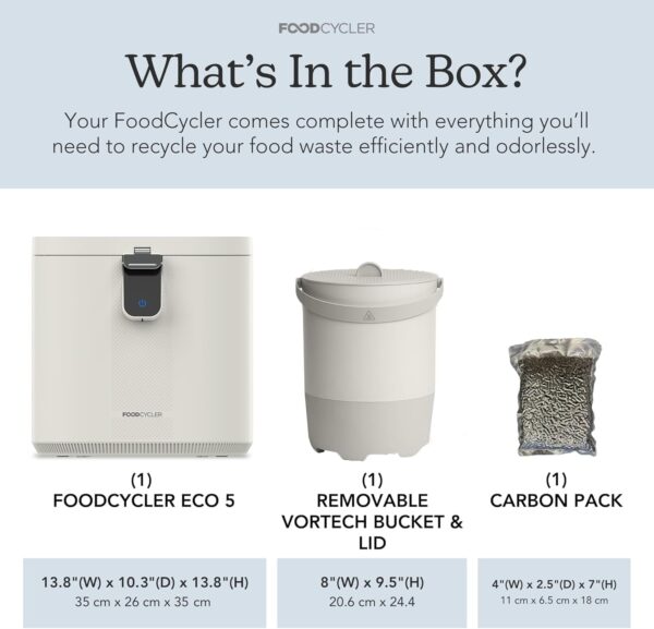 - TRANSFORM KITCHEN WASTE INTO PLANT FOOD -WITHOUT LIFTING A FINGER: The FoodCycler Eco 5 is a convenient solution to elimiate food waste. Ideal for busy homes, the Eco 5 does the clean up. It quietly grinds your food waste into plant food, reducing odors, messes and the amount of trash you take out.