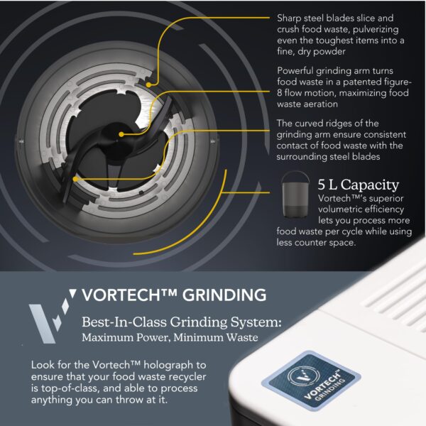 - INNOVATIVE VORTECH SYSTEM: The Eco 5’s Vortech(TM) patented grinding system can grind what others can’t. Toss in your pits, peels, bones, leftovers! Vortech’s efficiency means the FoodCycler consumes less power than your average clothes dryer.