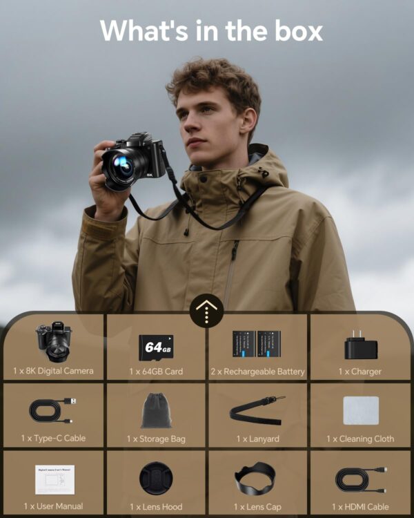 - 【Mode Dial & Exceptional Service】Backed by 12 months hassle-free promise- refund and replacement. Your creativity deserves peace of mind. Unlock creativity with 8 modes: Smart Auto, Portrait, Scenery, Slow Motion, Time-Lapse, and more. The mode dial makes switching effortlessly—ideal for beginners and hobbyists. Packaged in a sleek gift-ready box, this 8k digital camera is ideal for teens, travelers, or anyone starting their cameras for photography journey