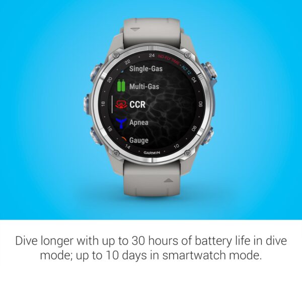 - Battery performance: up to 10 days in smartwatch mode and up to 30 hours in dive mode — so you can dive without worrying about battery life and go longer between recharges